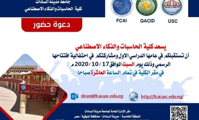 أكد الدكتور أحمد بيومى رئيس جامعة مدينة السادات أن السبت المقبل 17 أكتوبر 2020 تحتفل كلية الحاسبات والذكاء الإصطناعى ببدء الدراسة فى عامها الأول وسيتم إستقبال طلاب الدفعة الأولى لعامها الدراسى ٢٠٢١/٢٠٢٠م