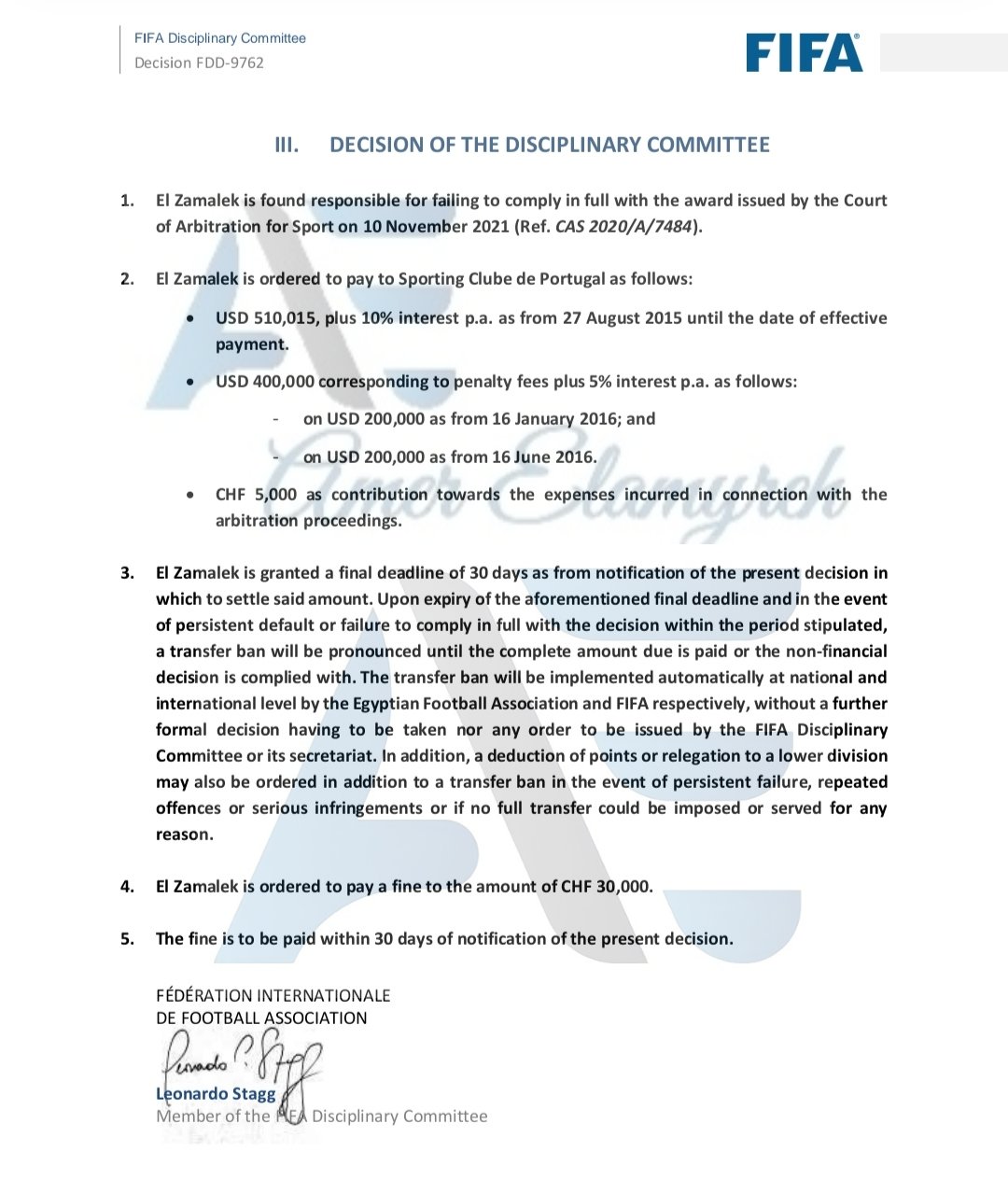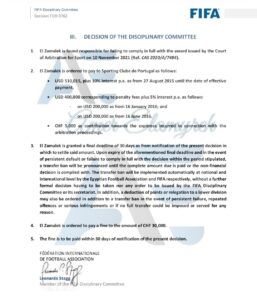 أصدرت اللجنة التأديبية للفيفا قرارا ضد نادي الزمالك المصري لصالح نادي سبورتنج لشبونه البرتغالي لعدم تنفيذ قرار محكمة التحكيم الرياضية الكاس بتاريخ 10نوفمبر 2021.جاء فيه: