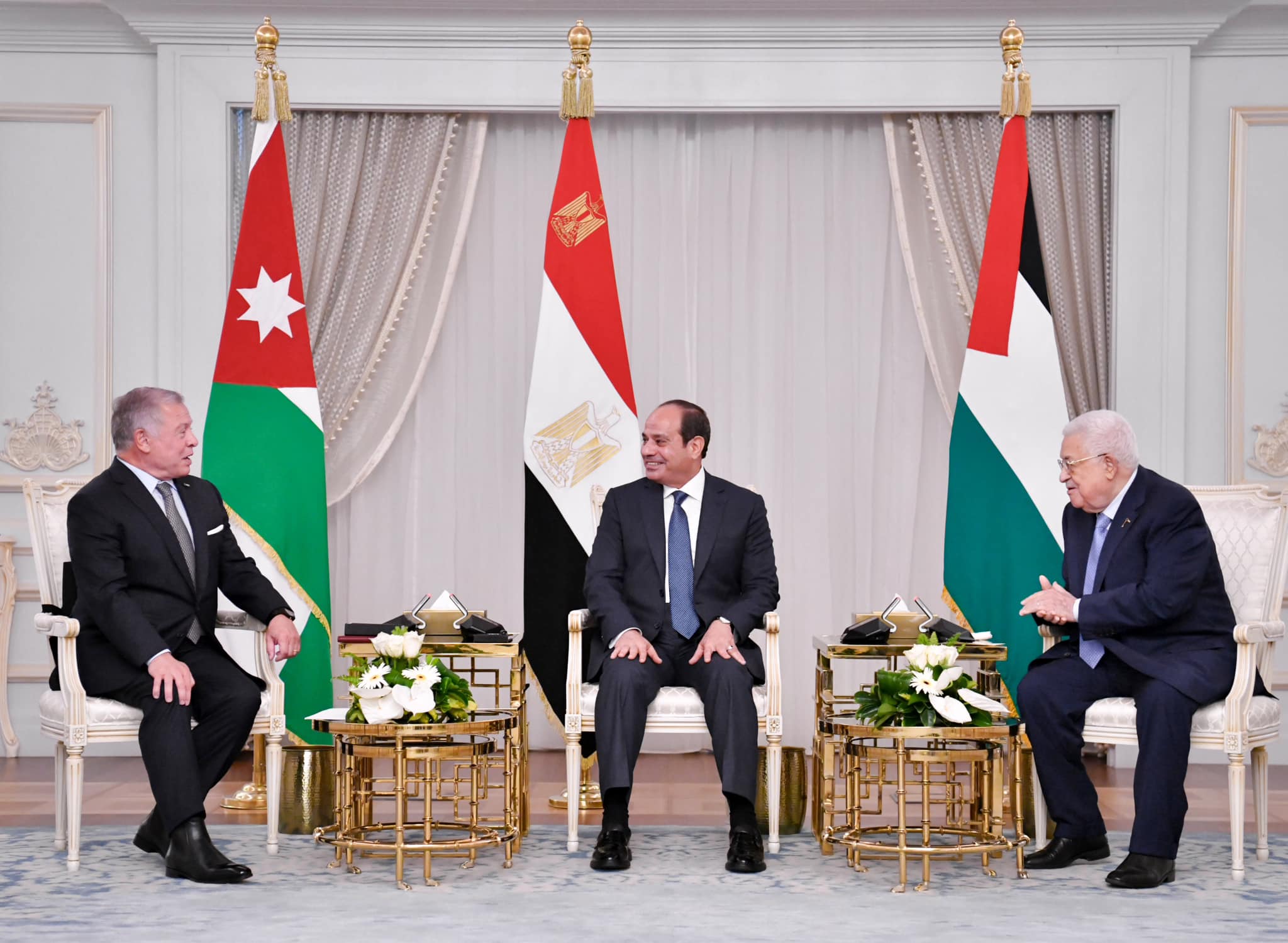 1. استضاف فخامة الرئيس عبد الفتاح السيسي رئيس جمهورية مصر العربية في قمة ثلاثية، صاحب الجلالة الهاشمية الملك عبد الله الثاني ابن الحسين ملك المملكة الأردنية الهاشمية، وفخامة الرئيس محمود عباس رئيس دولة فلسطين، في العلمين يوم ١٤ أغسطس/ آب ۲۰۲۳، وذلك لبحث تطورات القضية الفلسطينية في ضوء المستجدات الراهنة في أرض دولة فلسطين المحتلة، والأوضاع الإقليمية والدولية المرتبطة بها.