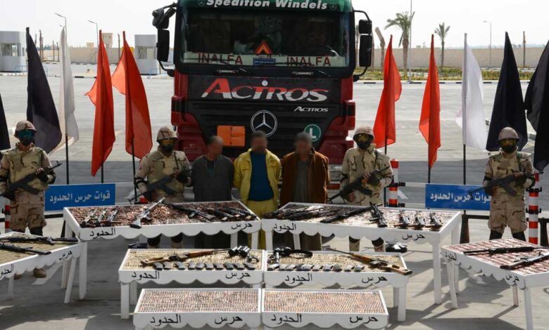 حيث كثفت عناصر التفتيش والكشف عن المهربات من جهودها التى أسفرت عن ضبط عربة نقل مُحمل عليها مكعبات مياه وعدد من البراميل والتى عثر بداخلها على (19) بندقية آلية و(20) خزينة لبنادق آلية و(4) بنادق آلية FN، و(3) رشاشات متعدد، بالإضافة إلى (2 ) نظارة ميدان و(2) تليسكوب قناصة، كما تم ضبط كميات كبيرة من الذخائر بلغت (15627) ذخيرة أنواع .