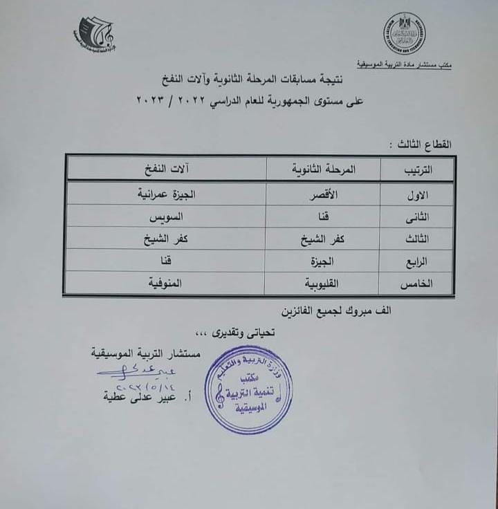 أعلن مكتب مستشار مادة التربية الموسيقية بوزارة التربية والتعليم، إلى إحراز كورال مديرية التربية والتعليم بقنا للمركز الثاني على مستوى الجمهورية في مسابقات المرحلة الثانوية، وكذلك تحقيقهم المركز الرابع في مسابقة آلات النفخ للعام الدراسي الحالي 2022/2023.