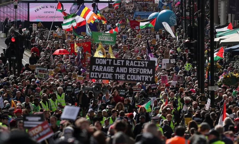 شهدت العاصمة البريطانية واحدة من أكبر المظاهرات في الآونة الأخيرة، حيث خرج عشرات الآلاف في مسيرة احتجاجية ضد صعود حزب “الإصلاح المتطرف” بقيادة نايجل فاراج، وسط حضور بارز لشعارات مؤيدة لفلسطين وأعلام إيرانية، في مشهد يعكس تصاعد التوتر السياسي والاجتماعي في البلاد.