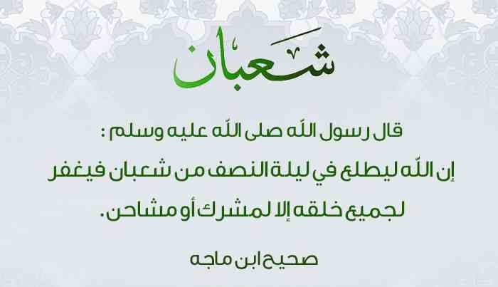“يَطَّلِعُ اللَّهُ إِلَى جَمِيعِ خَلْقِهِ لَيْلَةَ النِّصْفِ مِنْ شَعْبَانَ، فَيَغْفِرُ لِجَمِيعِ خَلْقِهِ، إِلَّا لِمُشْرِكٍ أَوْ مُشَاحِن”