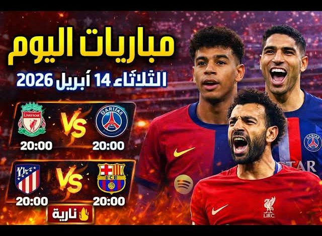 يشهد اليوم الثلاثاء 14 أبريل 2026 مجموعة من المباريات القوية والمثيرة في مختلف البطولات المحلية والعالمية، حيث تتنوع المنافسات بين الدوري المصري، دوري أبطال أوروبا، دوري أبطال آسيا، إضافة إلى مواجهات كرة اليد في كأس مصر. ويستعرض موقع وضوح الإخباري لقرائه أبرز المواعيد والقنوات الناقلة لهذه المباريات.