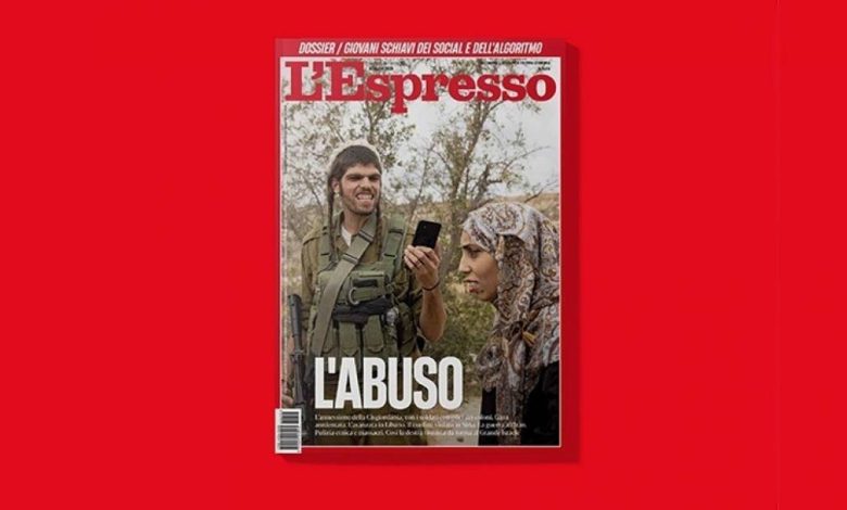 وتحت عنوان “الاعتداء” (L’abuso)، نشرت المجلة غلافا عليه صورة جندي بجيش الاحتلال مسلح يعتمر “كيباه” (قلنسوة يرتديها الصهاينة المتشددون دينيا)، وهو يصوّر بهاتفه امرأة فلسطينية بعدوانية تظهرها تعبيرات وجهه.