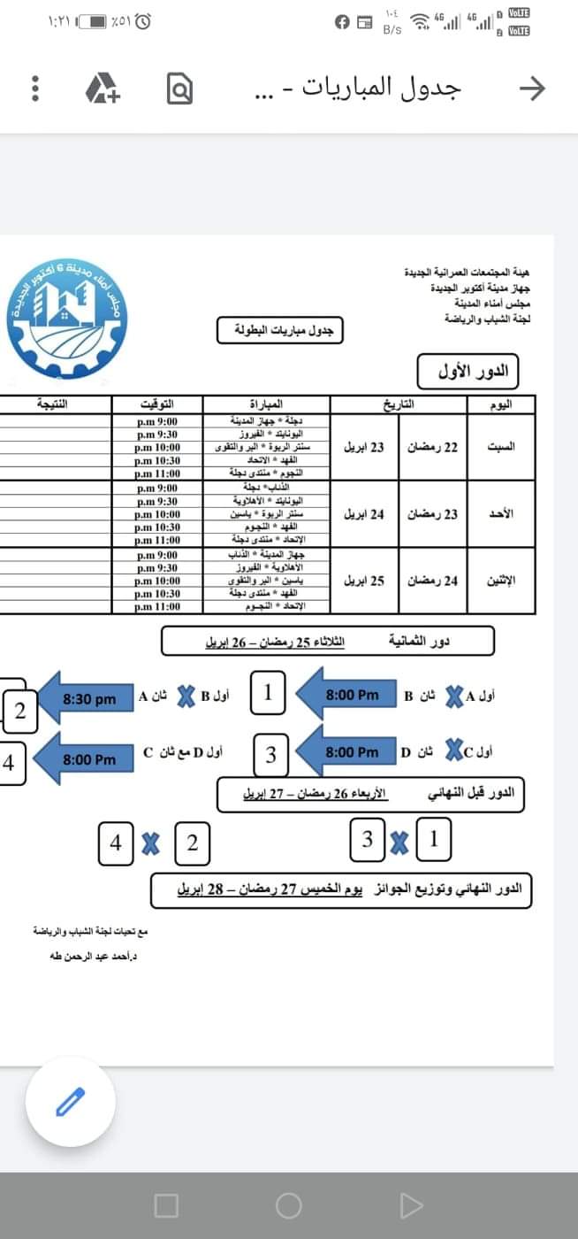 اكد ان الدوره الرمضانية فى كرة القدم الخماسي التى تنظمها لجنة الشباب والرياضة بمجلس امناء اكتوبر الجديدة تجرى تحت رعاية جهاز مدينة اكتوبر الجديدة وجمعية البر والتقوى على ملعب مركز شباب ال 800 فدان.