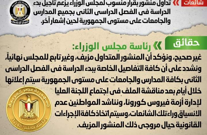 تداول منشور بقرار منسوب لمجلس الوزراء يزعم تأجيل بدء الدراسة في الفصل الدراسي الثاني بجميع المدارس والجامعات على مستوى الجمهورية لحين إشعار آخر