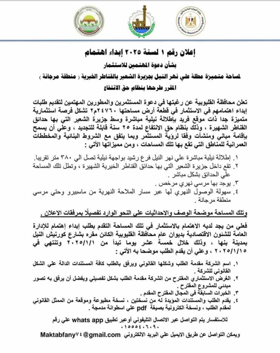 حيث أعلنت محافظة القليوبية عن رغبتها في دعوة المستثمرين والمطورين المهتمين لتقديم طلبات إبداء اهتمامهم في الاستثمار في قطعة أرض مساحتها 24760م2 تشكل فرصة استثمارية متميزة جدا ذات موقع فريد بإطلالة نيلية مباشرة وسط جزيرة الشعير التي بها حدائق القناطر الشهيرة ، وذلك بنظام حق الانتفاع لمدة 25 سنة قابلة للتجديد ، وعلي أن يسمح بإقامة مباني ومنشآت وفقا لرؤية المستثمر وبما يتفق مع الشروط البنائية والمخططات العمرانية للمناطق التي تقع بها تلك المساحات .