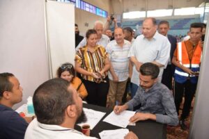 وتفقد محافظ أسيوط ومرافقوه أقسام الملتقى وشاهد إقبال الشباب على التقديم بالشركات والتقى ببعض الشباب وأصحاب الشركات المشاركة واطمئن على الوظائف المتاحة ومدى اقبال الشباب عليها