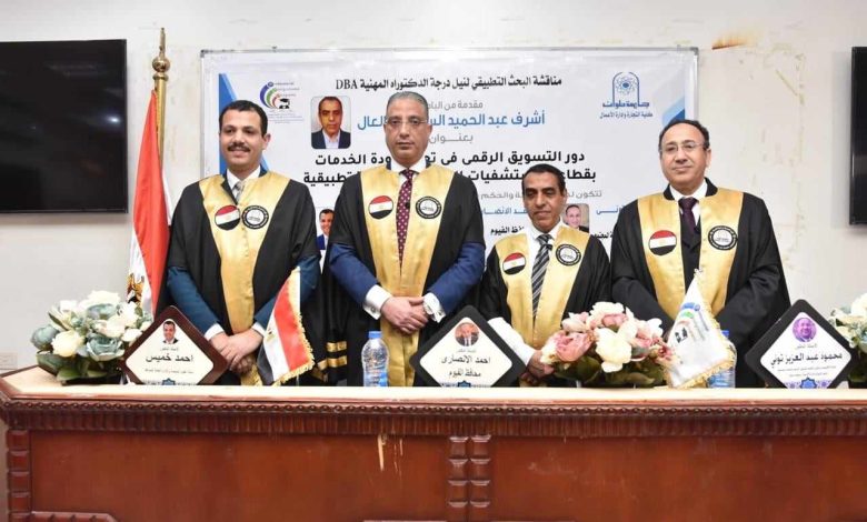 ناقش الباحث أشرف عبد الحميد بحثه التطبيقي لنيل درجة الدكتوراة المهنية في إدارة الأعمال بكلية التجارة وإدارة الأعمال جامعة حلوان تحت عنوان “دور التسويق الرقمي في تعزيز جودة الخدمات بقطاع المستشفيات الحكومية دراسة تطبيقية”.