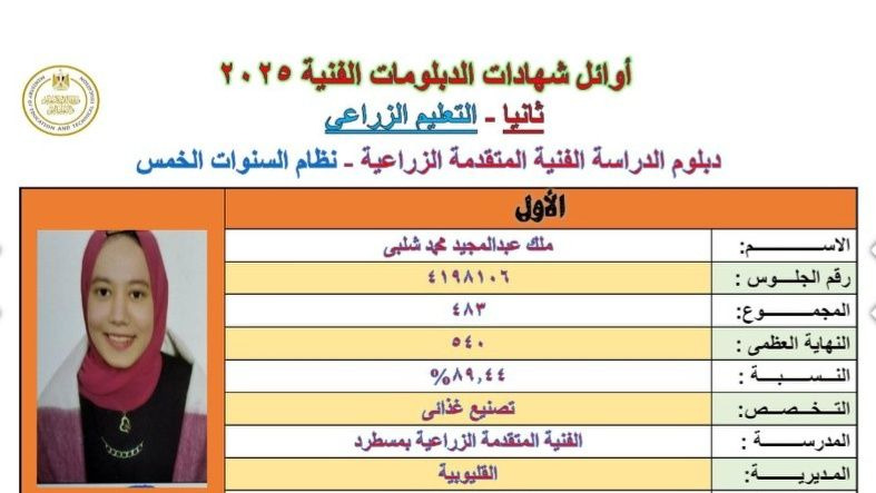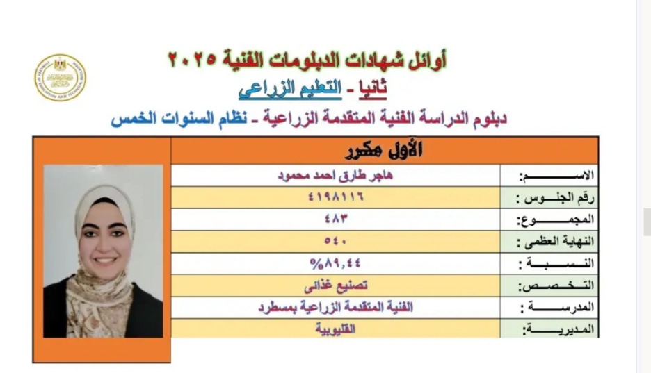 الطالبتان هاجر طارق أحمد محمود وملك عبد المجيد محمد شلبي، من المدرسة الفنية المتقدمة الزراعية بمسطرد – تخصص تصنيع غذائي، حققتا إنجازًا لافتًا بعد أن حصلت كل منهما على مجموع 483 درجة بنسبة 89.44%، ليصعد اسمهما إلى قائمة أوائل الجمهورية عن جدارة واستحقاق.