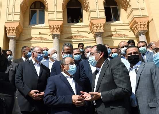 يرافقه وزراء السياحة والآثار والتربية والتعليم والتعليم الفني والتنمية المحلية والاتصالات وتكنولوجيا المعلومات وقطاع الأعمال العام ومحافظ القاهرة ومسئولو الهيئة الهندسية للقوات المسلحة