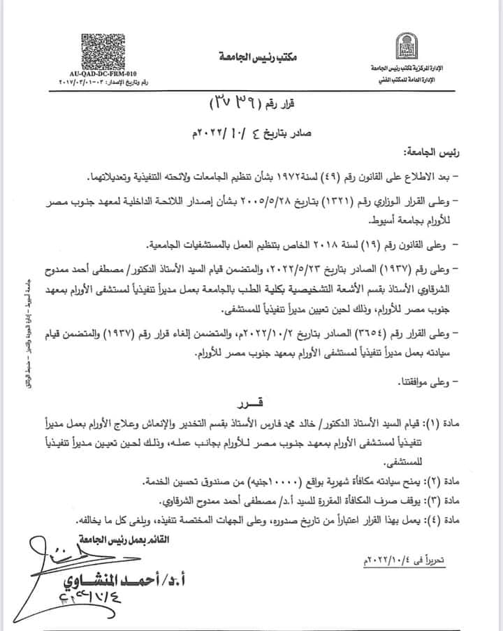 الصحفى محمدعبدالراضى يونس مراسل جريدة وموقع وضوح الاخبارى باسيوط يتقدم بخالص التهانى للدكتورخالد محمد فارس وكيل معهد جنوب مصر للأورام للدراسات العليا والبحوث بجامعة أسيوط على ثقة الدكتور أحمد المنشاوى القائم بعمل رئيس جامعة أسيوط وتكليف سيادته قائما بعمل مدير تنفيذى مستشفى الاورام بجامعة اسيوط .