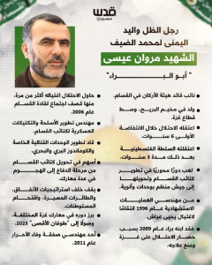 وبحسب تقرير للمركم الفلسطيني للإعلا م ،لم يكن استشهاد مروان عيسى، الملقب بـ**”كوماندوز فلسطين”**، مجرد رحيل عادي، بل هو امتداد لمسيرة حافلة بالتخطيط العسكري الذكي والتطوير النوعي للمقاومة. كان أحد العقول التي أسست منظومة الكوماندوز في كتائب القسام، وساهم بشكل مباشر في اختراق التحصينات الأمنية والعسكرية للاحتلال، خاصة في عمليات 7 أكتوبر.