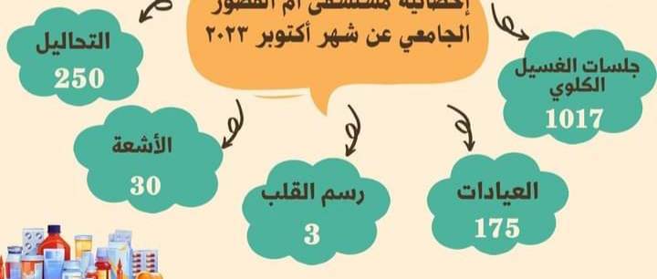 كشفت مستشفى أم القصور بجامعة أسيوط عن إجراء 1017 جلسة غسيل كلوي خلال شهر أكتوبر 2023 تحت رعاية الدكتور أحمد المنشاوي رئيس جامعة أسيوط والدكتور علاء عطية عميد كلية الطب ورئيس مجلس إدارة مستشفيات أسيوط الجامعية والدكتور إيهاب فوزي المدير التنفيذي لمستشفيات أسيوط الجامعية والدكتور عامر رجب أحمد مدير المستشفى والدكتورة عفت عبد الهادي رئيس وحدة الكلى الصناعي بمستشفيات أسيوط الجامعية وكما استقبلت المستشفى175 متردداً على العيادات الخارحية وتم إجراء 250 تحليلاً و30حالة أشعة