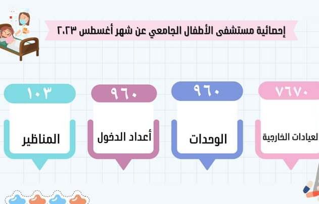 أعلنت مستشفى الأطفال بجامعة أسيوط عن استقبالها ٧٦٧٠ حالة مترددة على العيادات الخارجية خلال شهر أغسطس ٢٠٢٣ تحت رعاية الدكتور أحمد المنشاوي رئيس جامعة أسيوط والدكتور علاء عطية عميد كلية الطب بجامعة أسيوط ورئيس مجلس إدارة مستشفيات أسيوط الجامعية