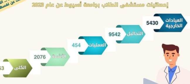 وأعلنت مستشفى الطلاب بجامعة أسيوط عن استقبالها 5430 مترددا على العيادات الخارجية خلال عام 2022/2023 وذلك تحت رعاية الدكتور أحمد المنشاوي رئيس جامعة أسيوط والدكتور علاء عطية عميد كلية الطب بجامعة أسيوط ورئيس مجلس إدارة مستشفيات أسيوط الجامعية والدكتور إيهاب فوزي المدير التنفيذي لمستشفيات أسيوط الجامعية والدكتور مصطفى فايز مدير مستشفى الطلاب بجامعة أسيوط بمشاركة أعضاء الكادر الطبي والإداري والأمنى بالمستشفى