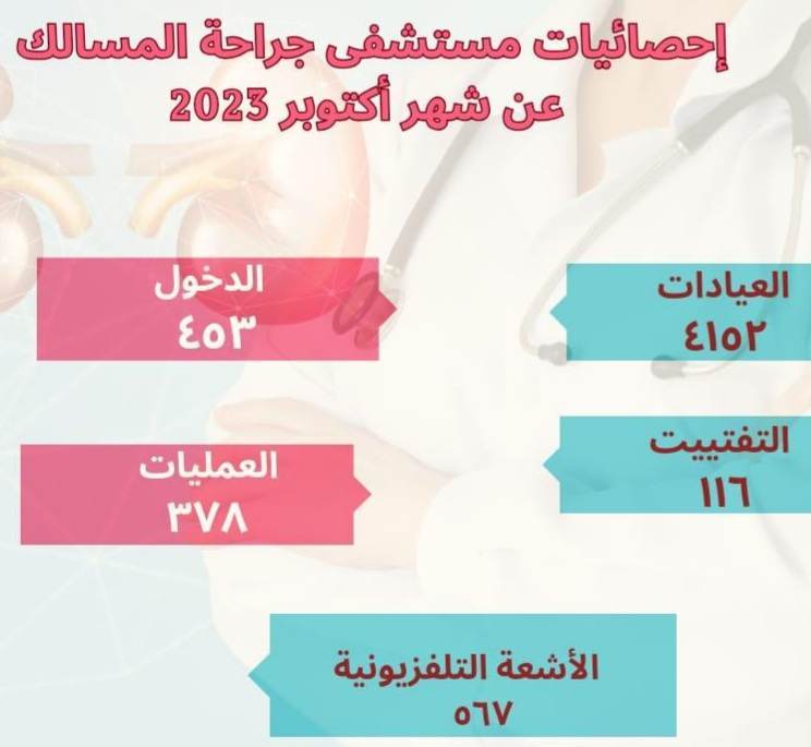 كما استقبلت مستشفى المسالك البولية والكلى بجامعة أسيوط 4152 مترددا على العيادات الخارجية خلال شهر أكتوبر 2023 .كما أعلنت المستشفى عن استقبالها 453 حالة دخول بالأقسام والوحدات المختلفة كما تم إجراء 378 عملية جراحية و 567إشاعة تليفزيونية و 116حالة تفتيت خلال الشهر نفسه.