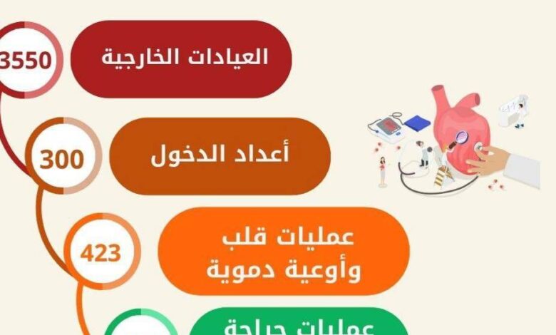 استقبلت مستشفى القلب بجامعة أسيوط 3550 متردداً على العيادات الخارجية خلال شهر أكتوبر 2023 .واستقبلت أيضا 300 حالة دخول بالقسم المجاني إلى جانب إجراء 423 عملية جراحية بقسم القلب والأوعية الدموية و101 عملية جراحية بقسم جراحة القلب والصدر خلال الشهر نفسه