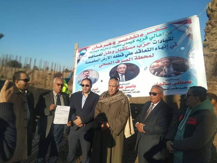 وقال النائب مصطفى سالمان أنه بناءا على تكليفات المهندس اشرف رشاد الشريف الامين العام والنائب الاول لرئيس الحزب خلال زيارتة الشهر الحالى لأمانة الحزب بصدفا بإعطاء تعليمات بالمساهمة من قبل الحزب بالإشتراك مع أهالى قرية كيمان سعيد لشراء قطعه أرض لانشاء محطه رفع صرف صحى للقرية وان الحزب سوف يساهم بمبلغ ٢٠٠ ألف جنية لهذا المشروع فقد تم اليوم توقيع العقد مع مالك الارض الذى ساهم بدورة بجزء من قيمة المبلغ وأكد أنه من المتوقع أن تدخل المحطة الخدمة خلال العام القادم لتخدم أهالى القرية واكد ان الحزب لايدخر جهدا للوقوف بجانب كل اهالينا بقرى المركز من منطلق مسئولية ودور الحزب المجتمعى بجانب دورة السياسى