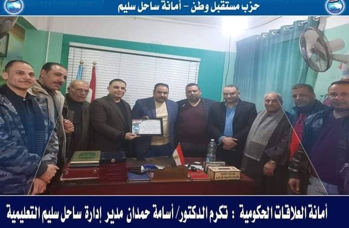 وبدأ الوفد زيارته للاداره التعليمية بساحل سليم وتكريم الدكتور أسامة حمدان مدير الاداره التعليمية بساحل سليم وكمال عبد الرحمن وكيل الإدارة وقام الوفد بتكريم الدكتور ماجدعبد العظيم مدير الإدارة الصحية بساحل سليم بما له من دور خدمي ملموس و فعال يستحق الاشاده والتقدير علي المستوي الوظيفي داخل المستشفي وقام الوفد أيضا بتكريم المحاسب على حسن مدير الضرائب العقارية بساحل سليم والمهندسة سماح عاطف مدير إدارة الري بساحل سليم وأسماء محمد علي مدير إدارة التضامن الاجتماعي بساحل سليم والمشهود لها بدورها الفعال داخل مركز ساحل سليم وعمرو محمد على مدير مكتب العمل بساحل سليم وسيد حسين مدير إدارة التموين بساحل سليم.