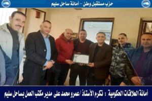 قام وفد من أمانة العلاقات الحكومية بحزب مستقبل وطن بمحافظة أسيوط برئاسة وائل خضراوى أمين أمانة العلاقات الحكومية بالحزب ومصطفي عبد المجيد أمين مساعد أمانة العلاقات الحكومية وأحمد ابوضيف عضو هيئه مكتب أمانة العلاقات الحكومية وسيد الحفناوى أمين أمانة العلاقات الحكومية حزب مستقبل وطن بمركز ساحل سليم وعدد من قيادات أمانة حزب مستقبل وطن بمركز ساحل سليم بتكريم عددا من القيادات التنفيذية بمركز ساحل سليم
