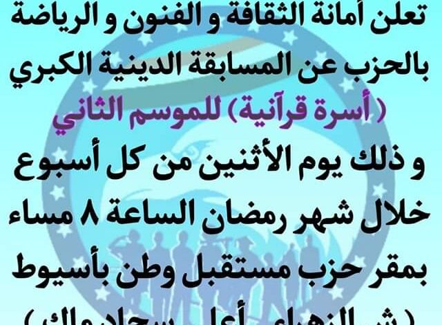 يطلق غدا الاثنين ٢٧ مارس ٢٠٢٣ حزب مستقبل وطن بمحافظة أسيوط المسابقة الرمضانية الكبرى للعام الثانى على التوالى تحت عنوان “أسرة قرآنية”.