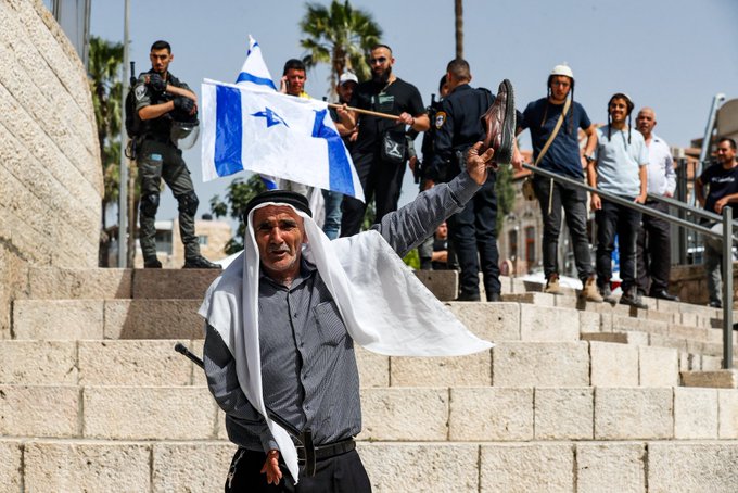 تداول الفلسطينيون عبر مواقع التواصل الإجتماعي على نطاق واسع صورة لمسن فلسطيني يرفع حذاءه بوجه المستوطنين وشرطة الاحتلال بمنطقة باب العامود في القدس المحتلة أثناء مسيرة الأعلام الصهيونية .