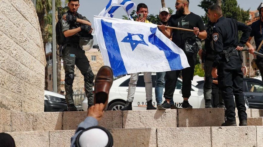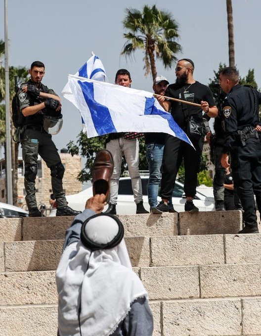 تداول الفلسطينيون عبر مواقع التواصل الإجتماعي على نطاق واسع صورة لمسن فلسطيني يرفع حذاءه بوجه المستوطنين وشرطة الاحتلال بمنطقة باب العامود في القدس المحتلة أثناء مسيرة الأعلام الصهيونية .