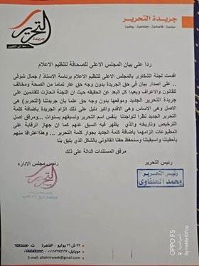 جريدة التحرير ترفض بيان لجنة الشكاوى بالمجلس الأعلى لتنظيم الإعلام