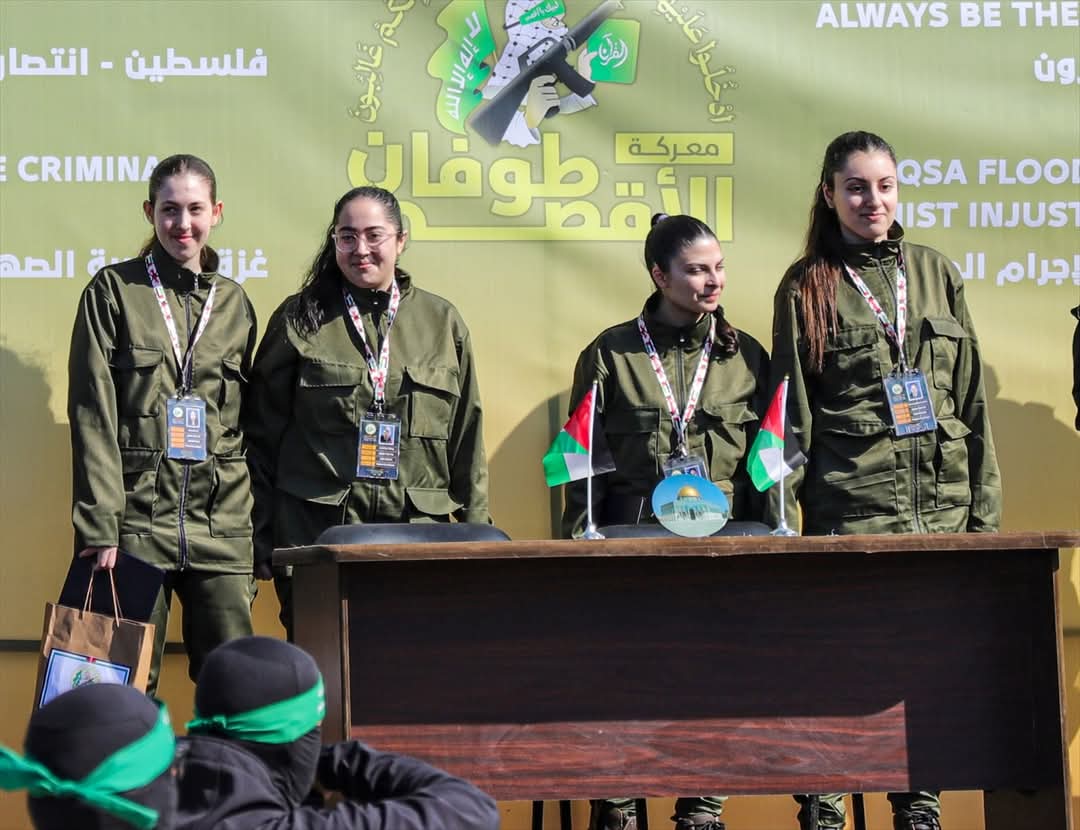 مشهد تسليم الأسيرات : المقاومة الفلسطينية تهين قادة الاحتلال وتضع صورهم تحت الاقدام