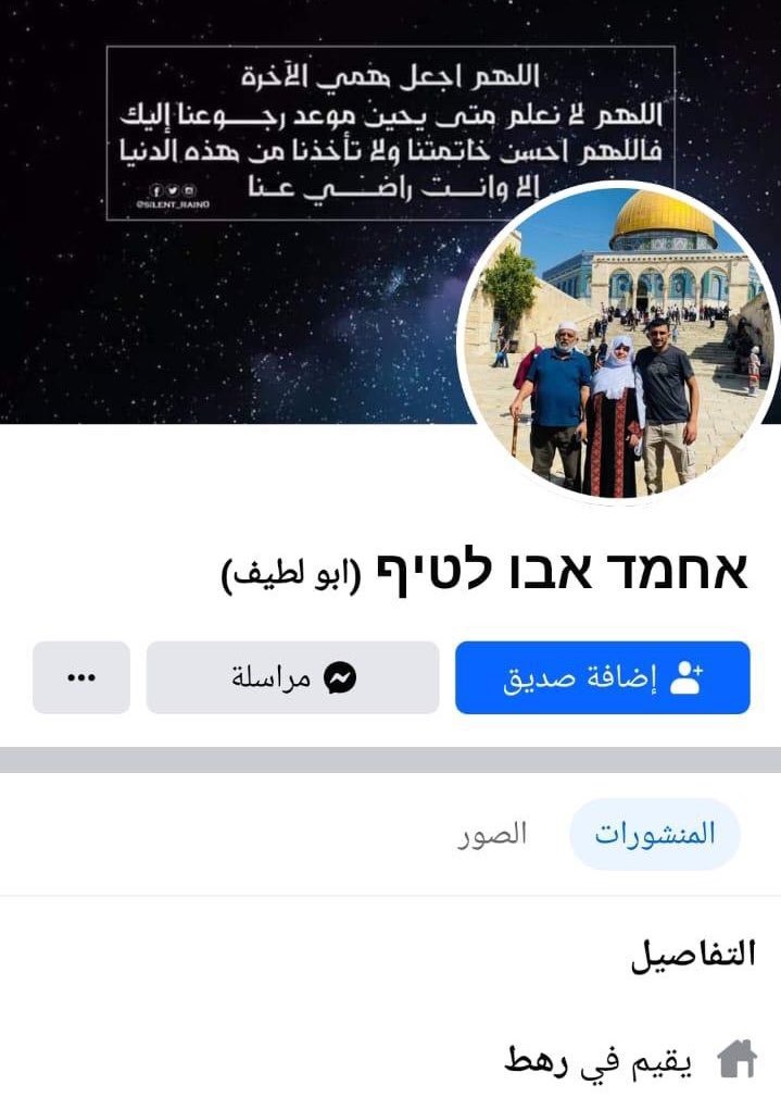 وتزداد عبثية وغرابة المشهد عند تصفح حساب “أحمد أبو لطيف” (26 عاماً) على “فيسبوك”، حيث تجده في صورته الشخصية واقفاً له مع والديه في المسجد الأقصى، إذ ترتدي والدته التي تقف إلى جانبه الزي الفلسطيني “الثوب”، فيما يعتمر والده طاقية الحجاج البيضاء. وتجده أيضاً يضع دعاءً في صورة غلاف صفحته كُتب فيه: “اللهم اجعل همي الآخرة… ولا تأخذنا إلا وأنت راض عنا”!