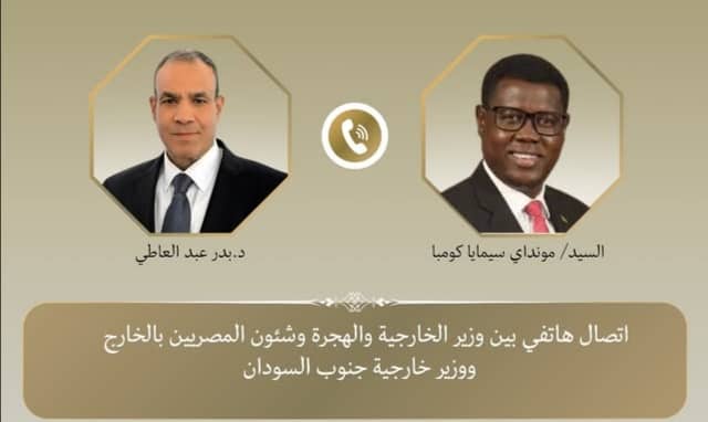 تلقى د. بدر عبد العاطي، وزير الخارجية والهجرة، اتصالاً هاتفياً اليوم الإثنين، من مونداي سيمايا كومبا، وزير خارجية جنوب السودان، تناول مجمل العلاقات الثنائية والتطورات الإقليمية ذات الاهتمام المشترك.