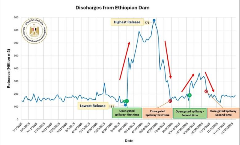 أوضحت الوزارة أن مشغّل السد الإثيوبي قام يوم 10 سبتمبر 2025 بتصريف نحو 485 مليون م³ من المياه، أعقبها زيادات مفاجئة وصلت إلى 780 مليون م³ في 27 سبتمبر، وهو ما أدى إلى انخفاض منسوب بحيرة السد بما يقارب مترًا واحدًا، أي ما يعادل تصريف نحو 2 مليار م³. ثم انخفضت التصريفات مرة أخرى إلى حوالي 380 مليون م³ يوم 30 سبتمبر.