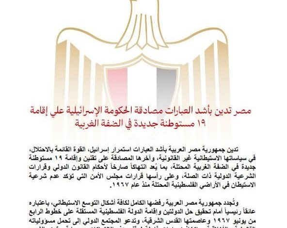 تدين جمهورية مصر العربية بأشد العبارات استمرار إسرائيل، القوة القائمة بالاحتلال، في سياساتها الاستيطانية غير القانونية، وآخرها المصادقة على تقنين وإقامة ١٩ مستوطنة جديدة في الضفة الغربية المحتلة، بما يُعد انتهاكاً صارخاً لأحكام القانون الدولي وقرارات الشرعية الدولية ذات الصلة، وعلى رأسها قرارات مجلس الأمن التي تؤكد عدم شرعية الاستيطان في الأراضي الفلسطينية المحتلة منذ عام ١٩٦٧.