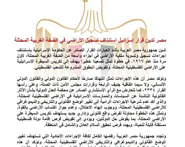 أدانت جمهورية مصر العربية بأشد العبارات القرار الصادر عن الحكومة الإسرائيلية باستئناف إجراءات تسجيل وتسوية ملكية الأراضي في أجزاء واسعة من الضفة الغربية المحتلة، لأول مرة منذ عام 1967، في خطوة تمثل تصعيدا خطيرا يهدف إلى تكريس السيطرة الإسرائيلية على الأراضي الفلسطينية المحتلة، وتقويض الحقوق المشروعة للشعب الفلسطيني.