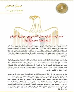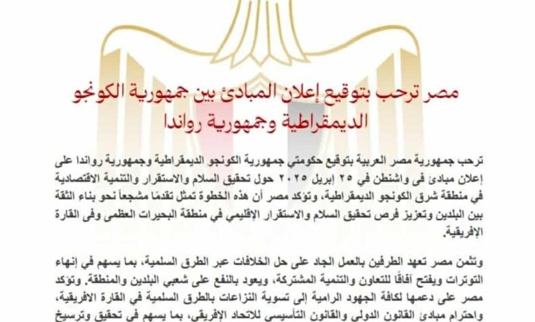 ترحب جمهورية مصر العربية بتوقيع حكومتي جمهورية الكونجو الديمقراطية وجمهورية رواندا على إعلان مبادئ فى واشنطن في ٢٥ إبريل ٢٠٢٥ حول تحقيق السلام والاستقرار والتنمية الاقتصادية في منطقة شرق الكونجو الديمقراطية، وتؤكد مصر أن هذه الخطوة تمثل تقدمًا مشجعاً نحو بناء الثقة بين البلدين وتعزيز فرص تحقيق السلام والاستقرار الإقليمي في منطقة البحيرات العظمى وفى القارة الإفريقية.