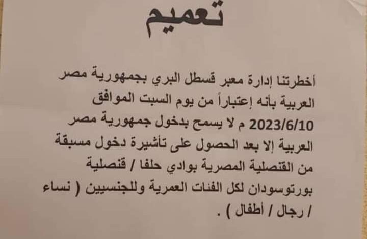 “اخطرتنا إدارة معبر قسطل البري بجمهورية مصر العربية بأنه اعتبارا من السبت الموافق 10/6/2023م لا يسمح بدخول جمهورية مصر العربية إلا بعد الحصول على تأشيرة دخول مسبقة من القنصلية المصرية بوادي حلفا /قنصلية بورتو سودان لكل الفئات العمرية وللجنسين “نساء /رجال/أطفال”
