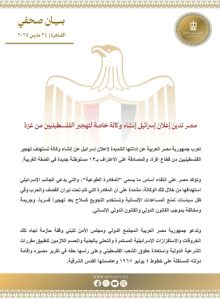 أدانت وزارة الخارجية المصرية، في بيان رسمي، المخطط الإسرائيلي، مشددة على أن مغادرة الفلسطينيين أراضيهم تحت القصف والتجويع القسري لا يمكن اعتبارها “مغادرة طوعية”.