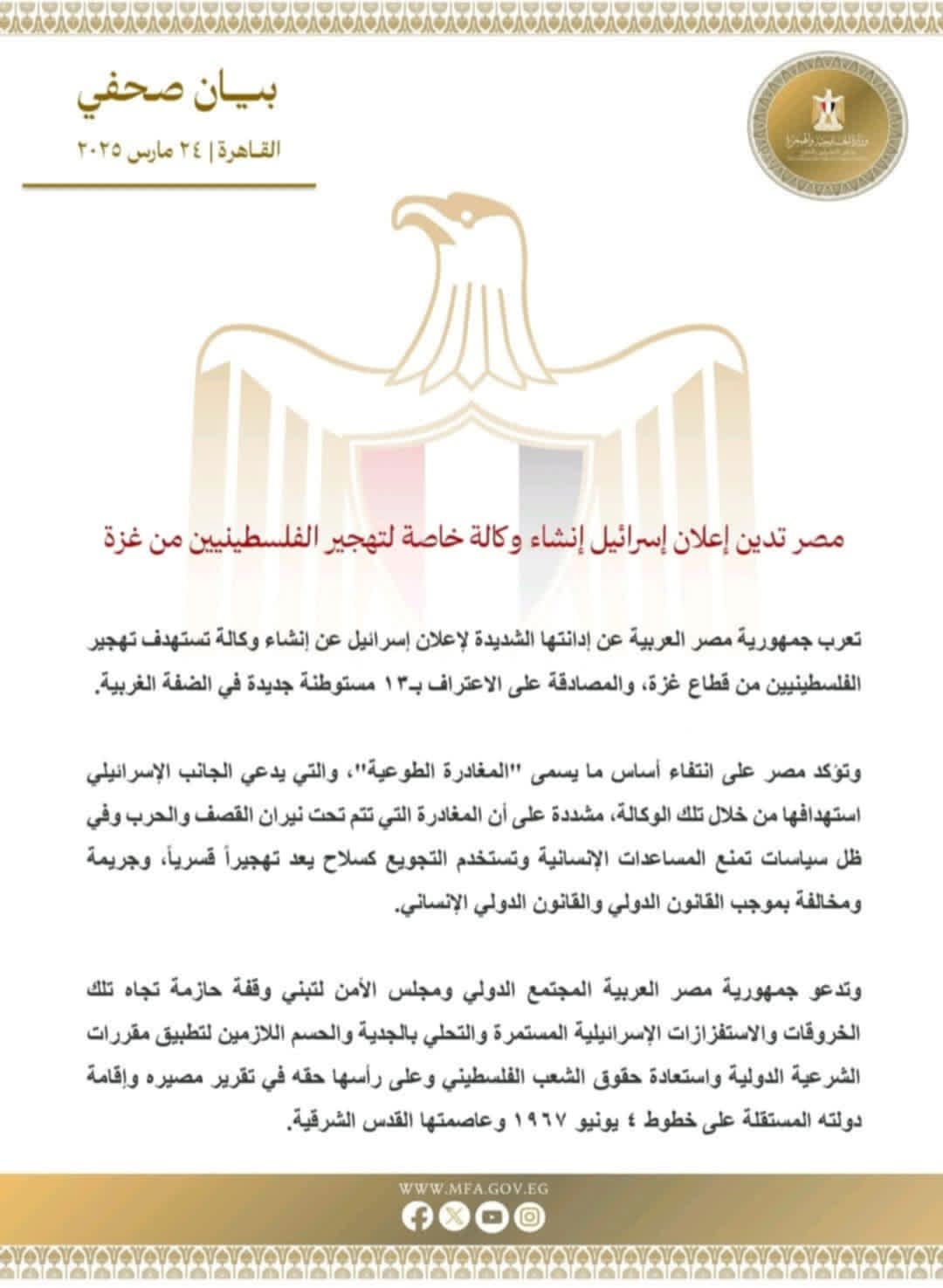 رفضت مصر وقطر بشدة قرار الاحتلال الإسرائيلي إنشاء وكالة خاصة لتهجير الفلسطينيين من قطاع غزة، معتبرتين ذلك انتهاكًا صارخًا للقانون الدولي.