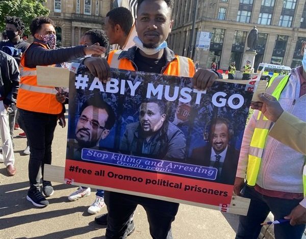 ورفع المتظاهرون لافتات كتبوا العليا “آبي أحمد لابد أن يرحل ” و ” توقف عن قتل الأورومو” و” الحرية لكل معتقلي الأورومو السياسيين”.