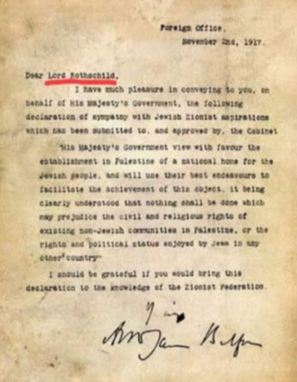 وجاء في نص الرسالة: “حكومة صاحب الجلالة تنظر بعين العطف إلى تأسيس وطن قومي للشعب اليهودي في فلسطين، وستبذل عظيم جهدها لتسهيل تحقيق هذه الغاية”.