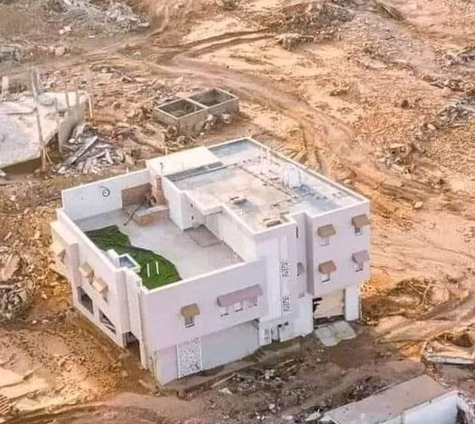 ووسط هذا الدمار الرهيب ، نرى معجزة إلهية في درنة التي تدمرت من الاعصار ، ووسط تلك البيوت المدمرة ، وقف بيت واحد لم يصبه أي أذى ، ولم يلحقه أي مكروه .. ربما تتخيل أن هذا بيت حاكم ليبيا أو حاكم درنة ..