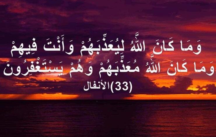 قال الله تعالى:﴿ وَمَا كَانَ اللَّهُ لِيُعَذِّبَهُمْ وَأَنتَ فِيهِمْ ۚ وَمَا كَانَ اللَّهُ مُعَذِّبَهُمْ وَهُمْ يَسْتَغْفِرُونَ﴾ الآية رقم ٣٣ من سورة الأنفال.