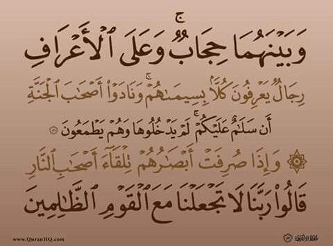 (وبينهما حجاب وعلى الأعراف رجال يعرفون كلاً بسيماهم ونادَوْا أصحاب الجنة أنْ سلام عليكم لم يدخلوها وهم يطمعون (٤٦) وإذا صُرِفَت أبصارهم تلقاء أصحاب النار قالوا ربنا لا تجعلنا مع القوم الظالمين(٤٧)ونادي أصحاب الأعراف رجالا يعرفونهم بسيماهم قالوا ما أغني عنكم جمعكم وما كنتم تستكبرون(٤٨) أهؤلآء الذين أقسمتم لا ينالهم الله برحمة أدخلوا الجنة لا خوف عليكم ولا أنتم تحزنون(٤٩) )الآيات من سورة الأعراف