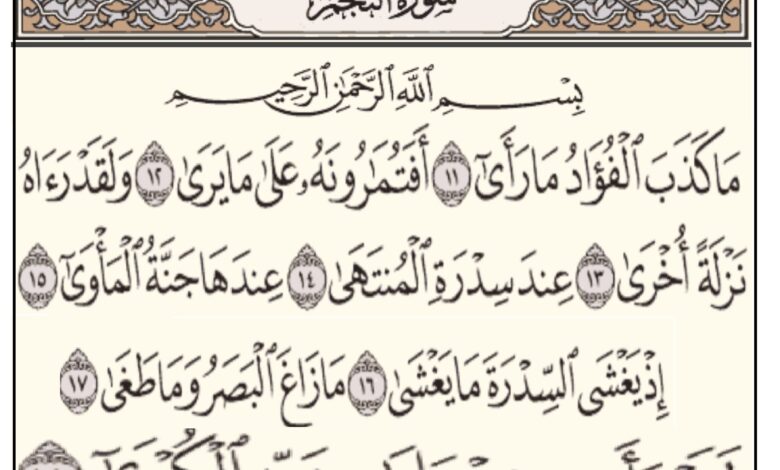 وقد تناولت آيات سورة النجم المذكورة في بداية هذا المقال أن الرسول –صلى الله عليه وسلم- قد رأى من آيات ربه الكبرى، وقد جاء في مختصر تفسير ابن كثير لتلك الآيات ما يلي: