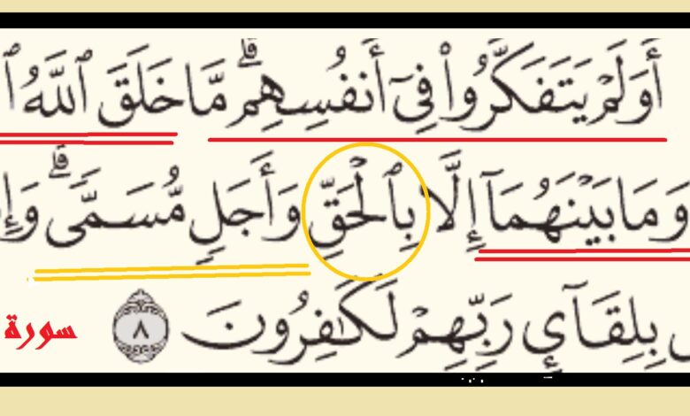 إن التفكر الذي تأمر به الآية ( 8 ) من سورة الروم يجعلنا ننتقل من التفكر في الأنفس (أو لم يتفكروا في أنفسهم) إلى التفكر في خلق السماوات والأرض وما بينهما، فالتفكر الأول (في أنفسهم) يؤدي حسب الآية للتفكر الثاني (ما خلقنا السماوات والأرض وما بينهما إلا بالحق)، وعليه يمكن أن نستنتج من ذلك أن هناك تشابها بين هذين المجالين من مجالات التفكر لأن النتيجة واحدة: أن ذلك الخلق تم بالحق والإحكام والدقة، ولم يتم عبثا ولا باطلا، وأن السماوات ليس فيها عيب ولا خلل كما أن خلق الكائن البشري –وجميع المخلوقات- ليس فيه عيب ولا خلل.