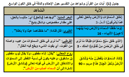 إن هذا التفكر في النفس البشرية التي نعلمها جميعا -سواء كنا من العوام أو من العلماء- لا بد أن يدفعنا إلى اليقين بأن المثال المقابل في الآية وهو الكون (السماوات والأرض وما بينهما) سيكون مخلوقا بنفس الإحكام والإبداع والتكامل والترابط الذي تحمله وتجمله كلمة “بالحق”، بل ويمكن القول أنه لا بد أن يكون هناك تشابها كبيرا بين هذين المجالين من مجالات الحقيقة الكونية (الإنسان والكون)، فالآية بداية تحثنا على التفكر في أنفسنا التي نعلم حقا وصدقا أنها تدل على عظمة وحكمة خالقها سبحانه وتعالى بالحق، ولا شك أن ذلك يجعلنا نصل إلى الاستنتاج بأن خلق السماوات والأرض وما بينهما تنطبق عليه أيضا نفس قاعدة التكامل النابع من الحق، ويتضح ذلك الإحكام والدقة في خلق ذلك الكون الواسع في العديد من آيات القرآن الكريم، والجدول (1) يذكر بعض هذه الآيات مع إشارات من كتب التفسير:
