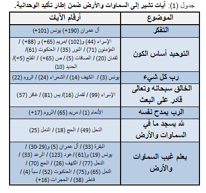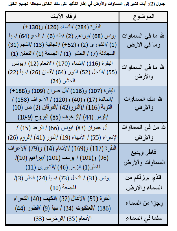 جاء في الجدولين (1 و 2) آيات من 117 موضعا من القرآن الكريم  تتضمن كلمتي السماوات والأرض في أساليب لغوية تهدف إلى تأكيد وحدانية الخالق سبحانه وتعالى، والناظر في المصحف الشريف يلاحظ ذكر هذه الأساليب في مواضع عديدة بطريقة توضح المنهج التربوي للقرآن الكريم، فعندما يدور السياق حول التصدق والبذل في سبيل الله تجد قوله تعالى: (ولله ميراث السماوات والأرض)، وعندما يدور السياق حول مايحيك في الصدور من أسرار تجد قوله تعالى: (ولله غيب السماوات والأرض)، وفي المواضع التي تتناول البعث والنشور يأتي قوله تعالى: (أو ليس الذي خلق السماوات والأرض بقادر على أن يخلق مثلهم)، فهذا الكون الواسع يقف شاهدا على القدرة والعلم والحكمة البالغة لخالقه عز وجل.