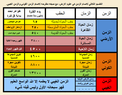 وعندما قرأت كلمات د.شرف القضاة (القضاة، 2011)، وجدت في نفسي إطمئنانا للمعنى الذي استنتجته من وجود توافق بين تلك النصوص الشرعية وبين المفاهيم المعروفة في علوم الأرض عن الزمن الجيولوجي، وقد وجدت الجداول المنشورة على موقع ويكيبيديا تعبر عما ندرسه في مقررات الجيولوجيا التاريخية ضمن مفهوم التقويم السنوي لتاريخ الكون (المدرك)، مع استثناء مفهوم بدء تاريخ الكون (المدرك) بالانفجار العظيم لأن كاتب هذه السطور يتبنى فكرة البناء العظيم حول خلق السماوات السبع بما فيها الكون المدرك (انظر المقال رقم 19 من هذه السلسلة حول خلق الكون).